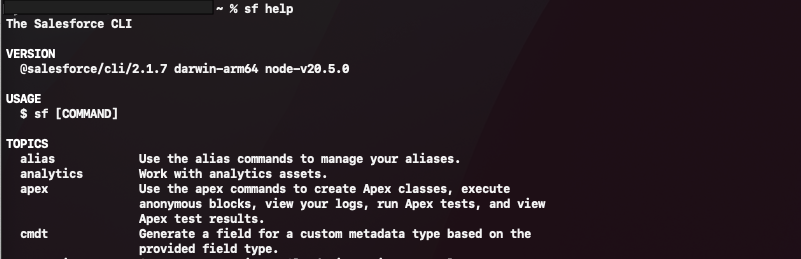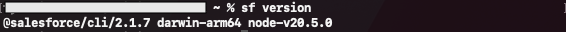 % sf version @salesforce/cli/2.1.7 darwin-arm64 node-v20.5.0