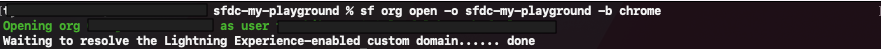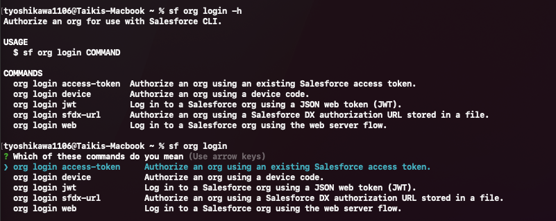 // ブラウザ指定 % sf org login web -b=chrome // URL指定 % sf org login web -r=https://test.salesforce.com // 複数条件指定 % sf org login web -b=chrome -r=https://test.salesforce.com