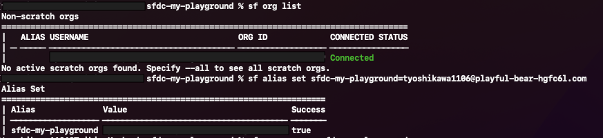 % sf config set target-org=<エイリアス名> % sf config set target-dev-hub=<エイリアス名>
