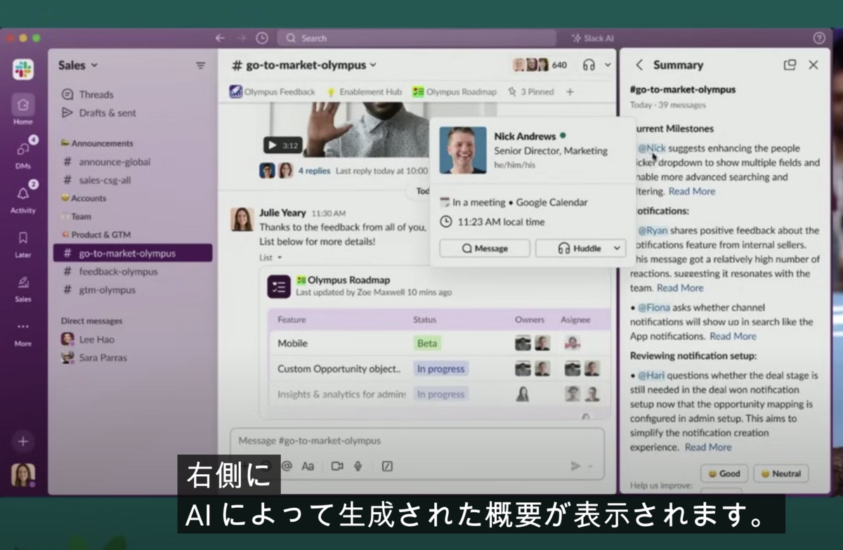 新しいSlackとSlack AIのデモ。